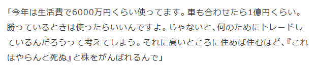 さらに、「1年間の生活費は約6,000万円で、車も合わせたら約1億円も使った」とテスタ氏は語っています。