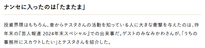 2024年末に、テスタ氏はお笑い芸人・みなみかわ氏の個人事務所「合同会社ナンセ」(現・株式会社ナンセ)に所属したことを発表して話題になりました。