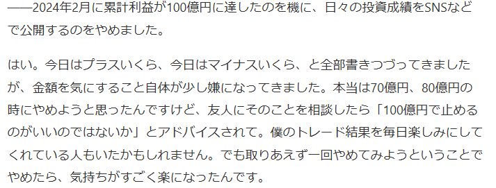 この節目に、テスタ氏は毎日の収支公開を止めると宣言しました。