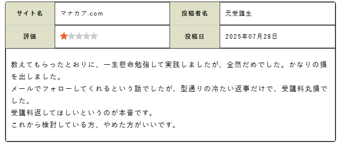「初心者でも安心」「サポートが神」と熱烈に支持する声もあれば、「料金が高すぎる」「中身はYouTubeレベル」との酷評も散見されます。