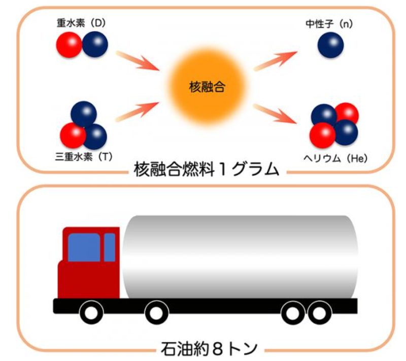 たった1グラムの燃料の核融合反応から発生するエネルギーは、タンクローリー1台分の石油(約8トン)を燃やしたときと同じだけの熱に相当します。