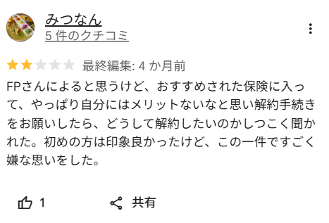 【悪い評判・口コミ】「保険の話ばかりされた」「FPと相性が合わなかった」