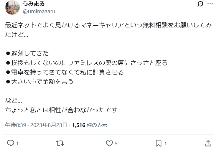 そのため、偶然マッチングされたFPが、自分の相談したい内容の専門家ではなかったり、あるいは単純に人間としての相性が合わなかったりするケースも起こり得るわけです。