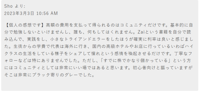「コミュニティとしての交流は楽しいが、投資サロンとして期待していたほどの具体的な成果は出ていない」