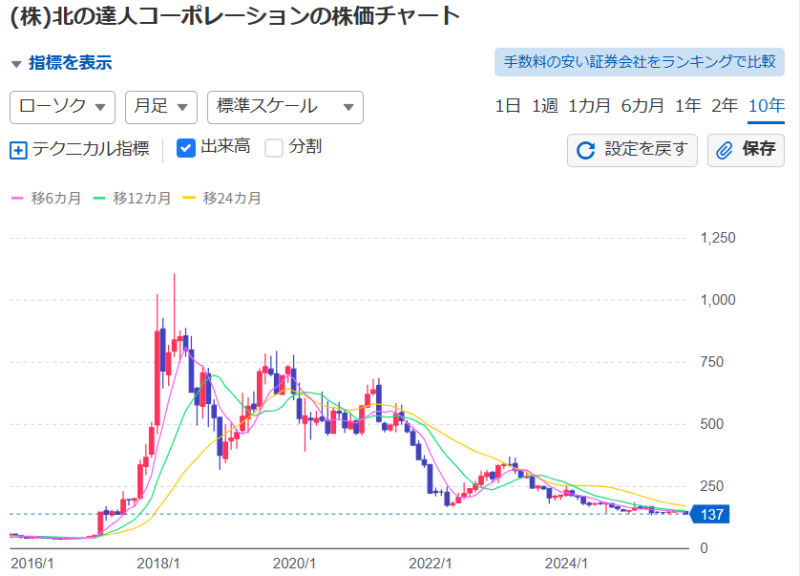 しかし、北の達人コーポレーションと同様、その後の株価推移は厳しいものがあります。