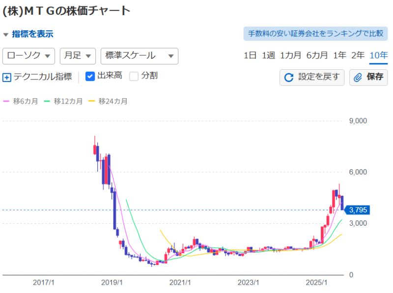 遠藤氏の銘柄選定能力と指導力を別の角度から検証するため、美容・健康機器の「SIXPAD」や「ReFa」で知られる「MTG」を見てみましょう。