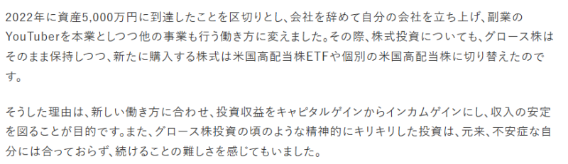 しかし、FIREを達成した現在は、キャピタルゲイン狙いのグロース株から、安定したインカムゲイン狙いに切り替えています。