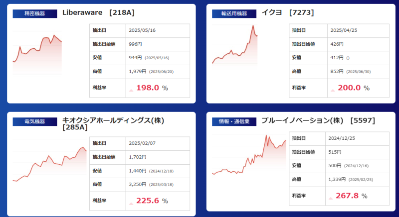実際に短期で株価2倍になった銘柄が紹介されており、見た目上の実績は華々しいものです。