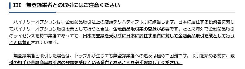 金融庁に登録していない海外業者は、日本人にサービスを提供すること自体が違法です。