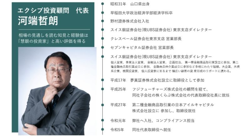 野村證券や外資系証券会社にて長年キャリアを積んだ人物とされており、「慧眼の投資家」とも称されています。