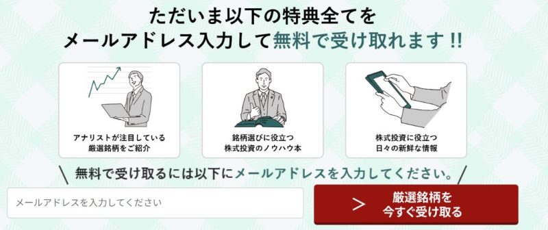 無料メール登録をすると、注目銘柄の情報提供や株式に関するノウハウなどの情報を得ることも可能です。