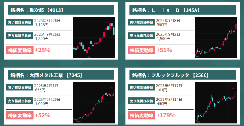公式サイト上では推奨銘柄の実績を公開しており、過去には下記のような銘柄で成果を上げたようです。