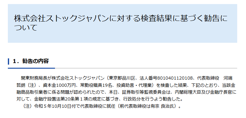 この株式会社ストックジャパンが、金融庁(関東財務局)から行政処分(1ヶ月間の業務停止命令及び業務改善命令)を受けています。