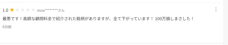 助言内容を鵜呑みにして投資した結果、想定外の損失を被ったという内容で、「高額な費用を払って損をした」という怒りがにじむ口コミです。