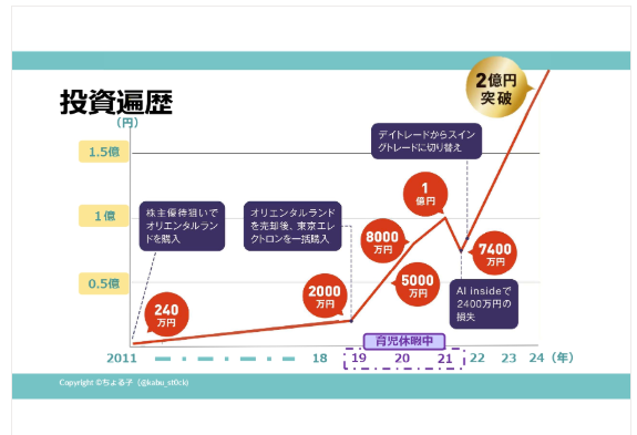 ちょる子氏とは、育児をしながら株式投資で2億円超(最高2億6,000万円)の資産を築いた「育ママ投資家」です。