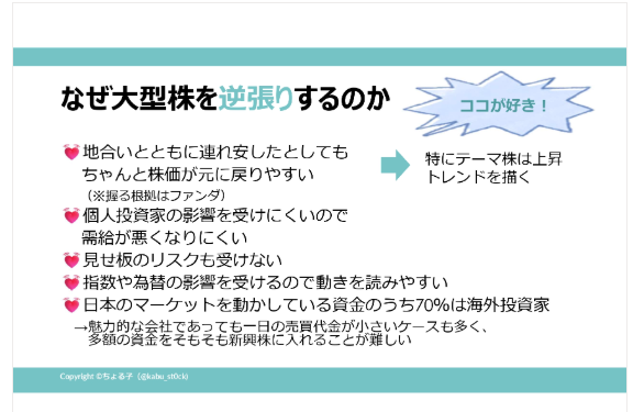 ちょる子氏の狙いは、サメたちが主戦場とする「流動性の高い大型株」に追随(コバンザメ)することです。