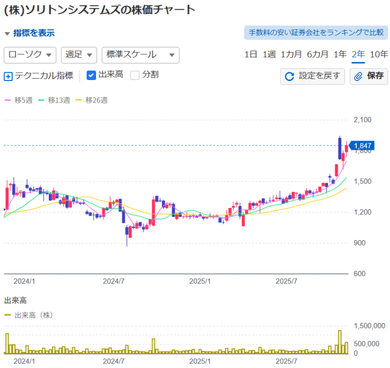 一方、技術力は高いソリトンシステムズですが、時価総額が300億~400億円の中小型株であるため、株式の出来高が少ないことがある点には注意が必要です。