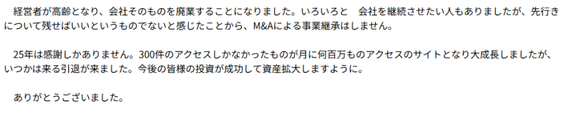 「終了します」の一言で片付けるには、あまりにも唐突な幕引きでした。