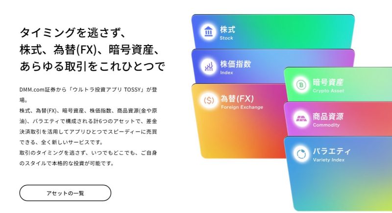 TOSSYは、株、株価指数、為替(FX)、暗号資産、商品資源(金や原油)、バラエティ(VIX(恐怖)指数)の6資産を1つにまとめて運用できるマルチ型投資アプリとして注目されています。