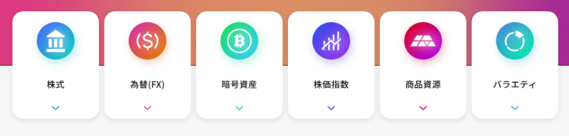 株、株価指数、為替(FX)、暗号資産、商品資源(金や原油)、バラエティ(VIX(恐怖)指数)の6資産を、1つの資金でまたいで取引できます。