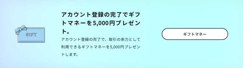 そして何より強烈なのが、アカウント登録を完了するだけで、取引に使える「ギフトマネー5,000円」がもらえる特典です。