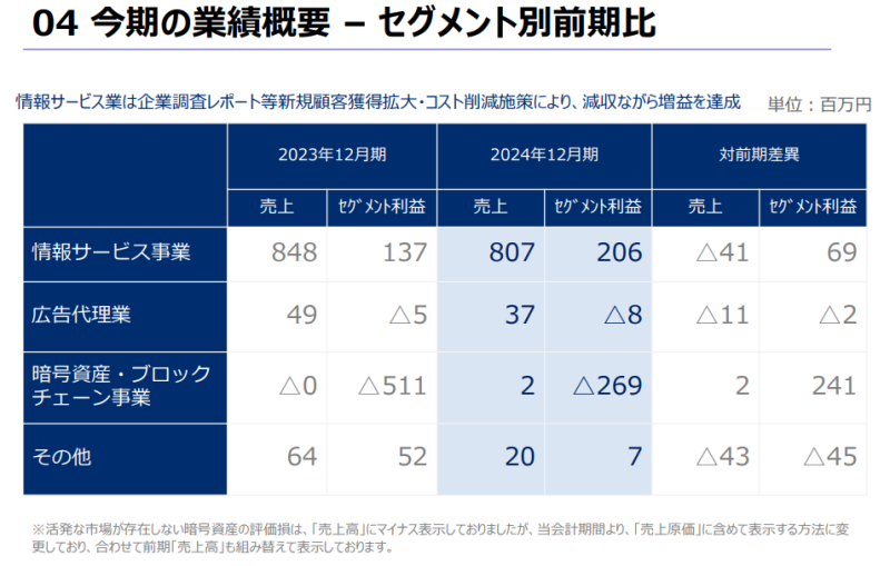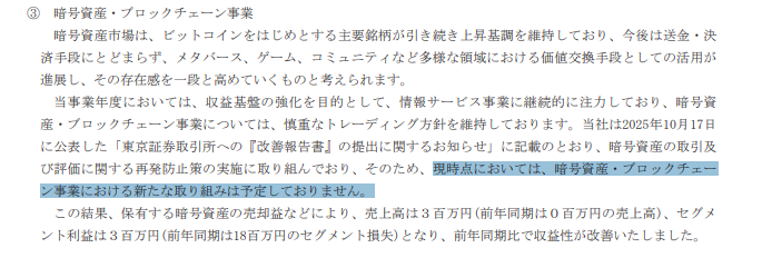 なんと、直近の決算資料における暗号資産事業については、「新たな取り組みの予定はしていない」と記載されているのです。