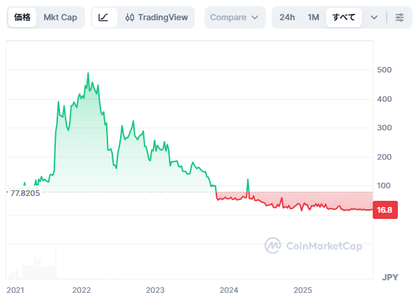 2022年の暗号資産バブル期には一時500円にまで達していたフィスココインの価格が、現在で約16円前後を彷徨っています。