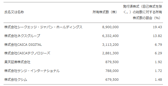 主要株主であるシークエッジ・ジャパン・ホールディングスや、関連会社のCAICA DIGITALなどとの間で、株式の持ち合いや事業譲渡が頻繁に行われています。