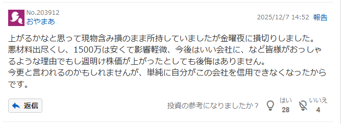 相場操縦で課徴金勧告を受けた企業に対して、まともな投資家なら当然の反応でしょう。