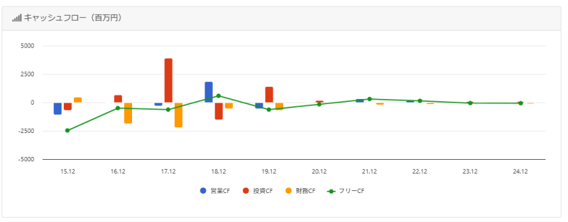 さらに営業キャッシュフローもマイナスとなっており、手元資金も心許ない水準まで減少しています。