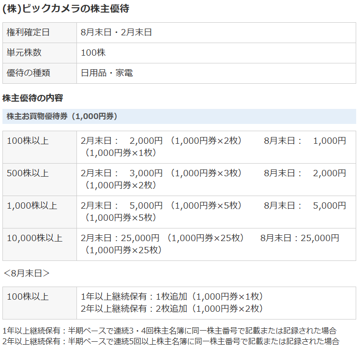 ビックカメラの特徴は、長期保有優遇制度が手厚いことです。
