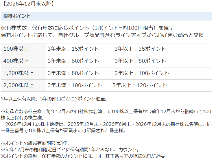 また、優待のdポイント付与には「2年以上保有」などの条件があり、買ってすぐに恩恵を受けられるわけではない点も要注意です。