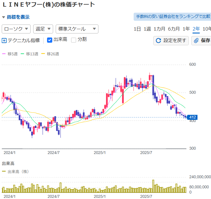 IT・通信セクターでありながら、度重なる不祥事や親会社の問題により株価が低迷し、バリュー株の領域まで売り込まれているのがLINEヤフーです。