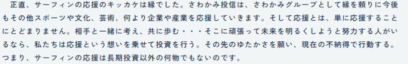 サーフィンへの応援もさわかみ投信の理念である「長期投資」だそう。