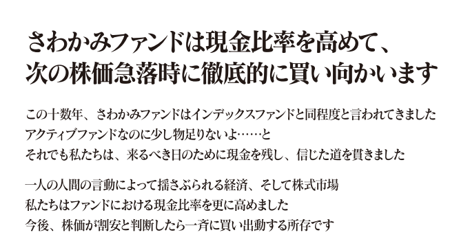 市場が暴落した時に買い向かうために、さわかみ投信はファンド内の現金の比率を高めることがあります。