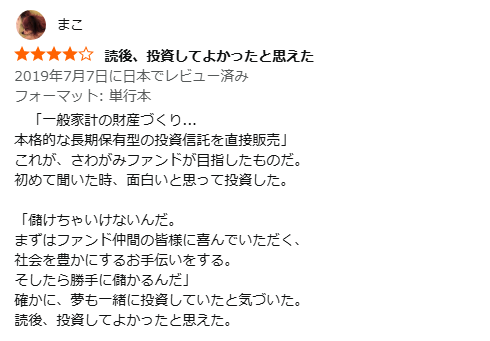 例えば、書籍『儲けない勇気 さわかみ投信の軌跡』には、その思想や投資哲学へ共感するレビューが投稿されています。