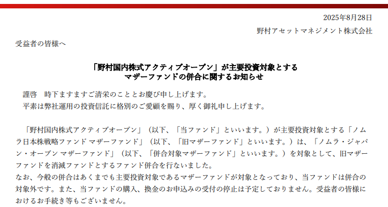 「ノムラ日本株戦略ファンド」を、「ノムラ・ジャパン・オープン」のマザーファンドへ統合し、名称を「野村国内株式アクティブオープン」へと変更することを発表したのです。