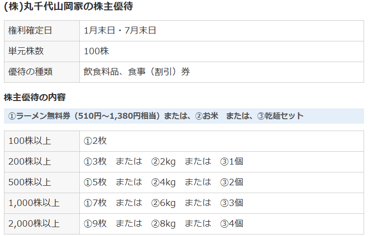 優待内容は「ラーメン無料引換券」2枚(100株保有時)や「お米」などから選択可能です。