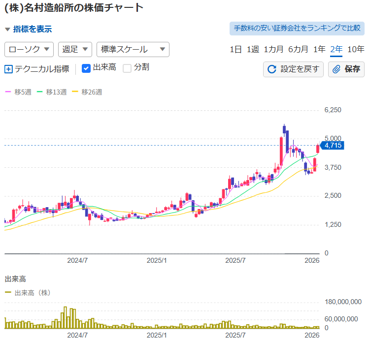 名村造船所は、国内造船専業の大手であり、業界を代表する船舶銘柄といえます。