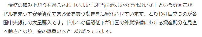 ドルや円への不信感がある限り、無国籍通貨としての金は強いと考えているからです。