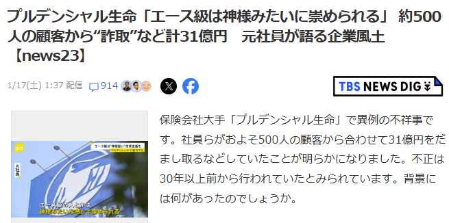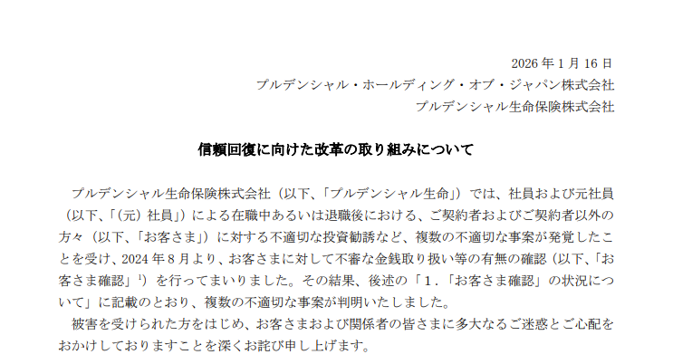 以前からニュースになっていたプルデンシャル生命の「巨額詐欺事件」といっても過言ではない不祥事ですが、2026年1月23日、ついに経営陣による謝罪会見が行われました。