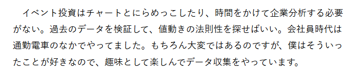 まつのすけ氏のイベント投資は、データで投資するので再現性があると評価する声があります。