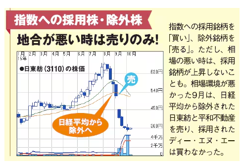 採用される株を先回りして買い、除外される株を空売りする。