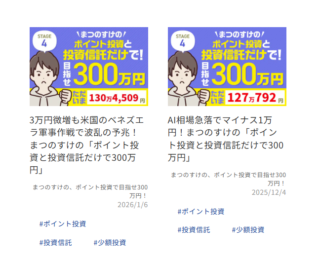 ポイント投資と投資信託だけで300万円を目指す企画も連載しています。