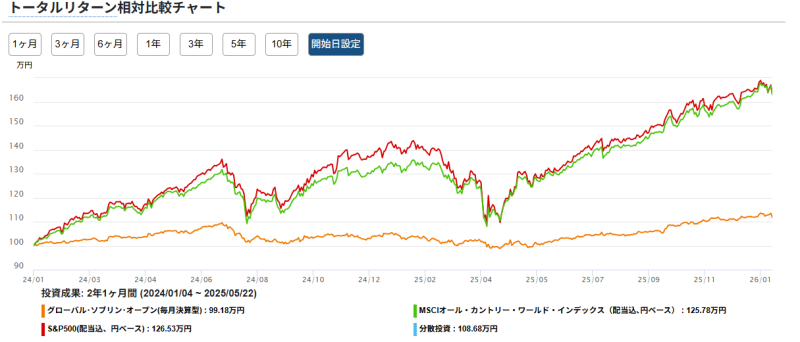 直近1年(2024年末〜2025年末)のグロソブのリターンはプラス6.7%です。