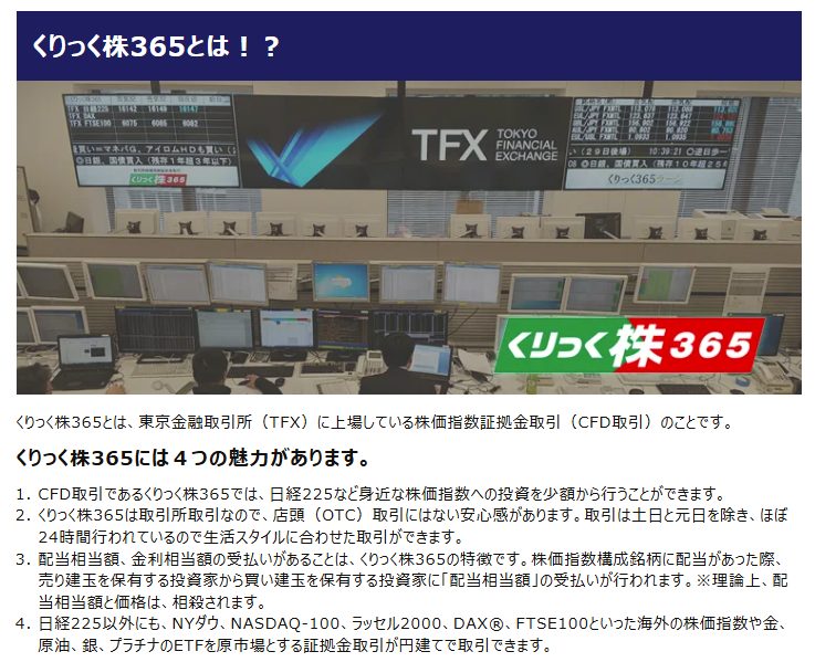 くりっく株365は、日経225(日経平均株価)やNYダウなどの株価指数を証拠金で取引できるサービスです。