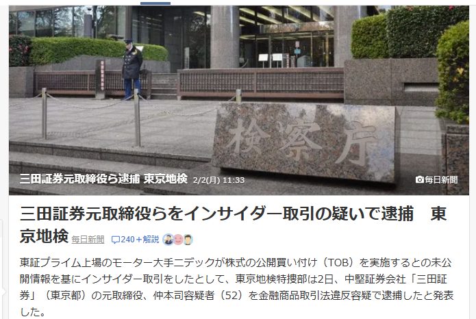 2026年2月2日、東京地検特捜部は、三田証券の元取締役投資銀行本部長である仲本司、別の会社役員の松木悠宣、小林真之、田中伸矢、阿部祐一の5人の容疑者をインサイダー取引などの容疑にて逮捕したことを発表しました。