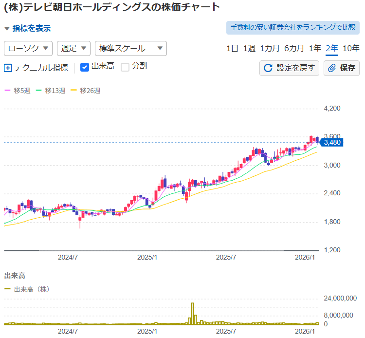 例えばメディア大手「テレビ朝日ホールディングス」(9409)も改善期間該当銘柄となっています。