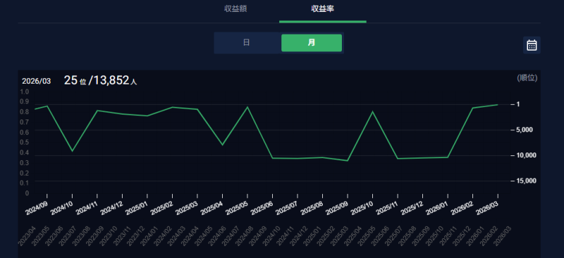 2025〜2026年にかけての資産は1,200万〜2,500万円あたりを推移しており、以下のように収益率を見ても天国と地獄を往復しています。