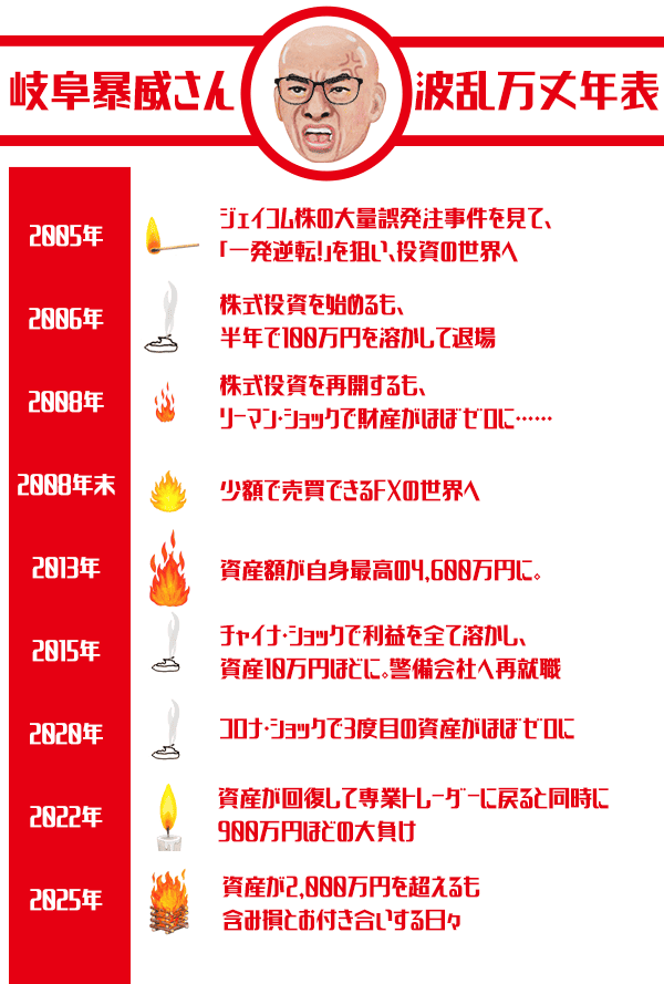 岐阜暴威氏の20年以上のキャリアが生んだ、笑えないけれど笑ってしまう投資伝説エピソードを厳選して紹介します。